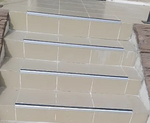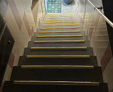 Способ монтажа: алюминиевый порожек без вставки крепится на ступени при помощи саморезов. Затем прорезиненную ПВХ вставку нужно нагреть строительным или обычным феном, либо подержать в горячей воде, чтобы материал стал мягче и легче вошел в паз профиля.
